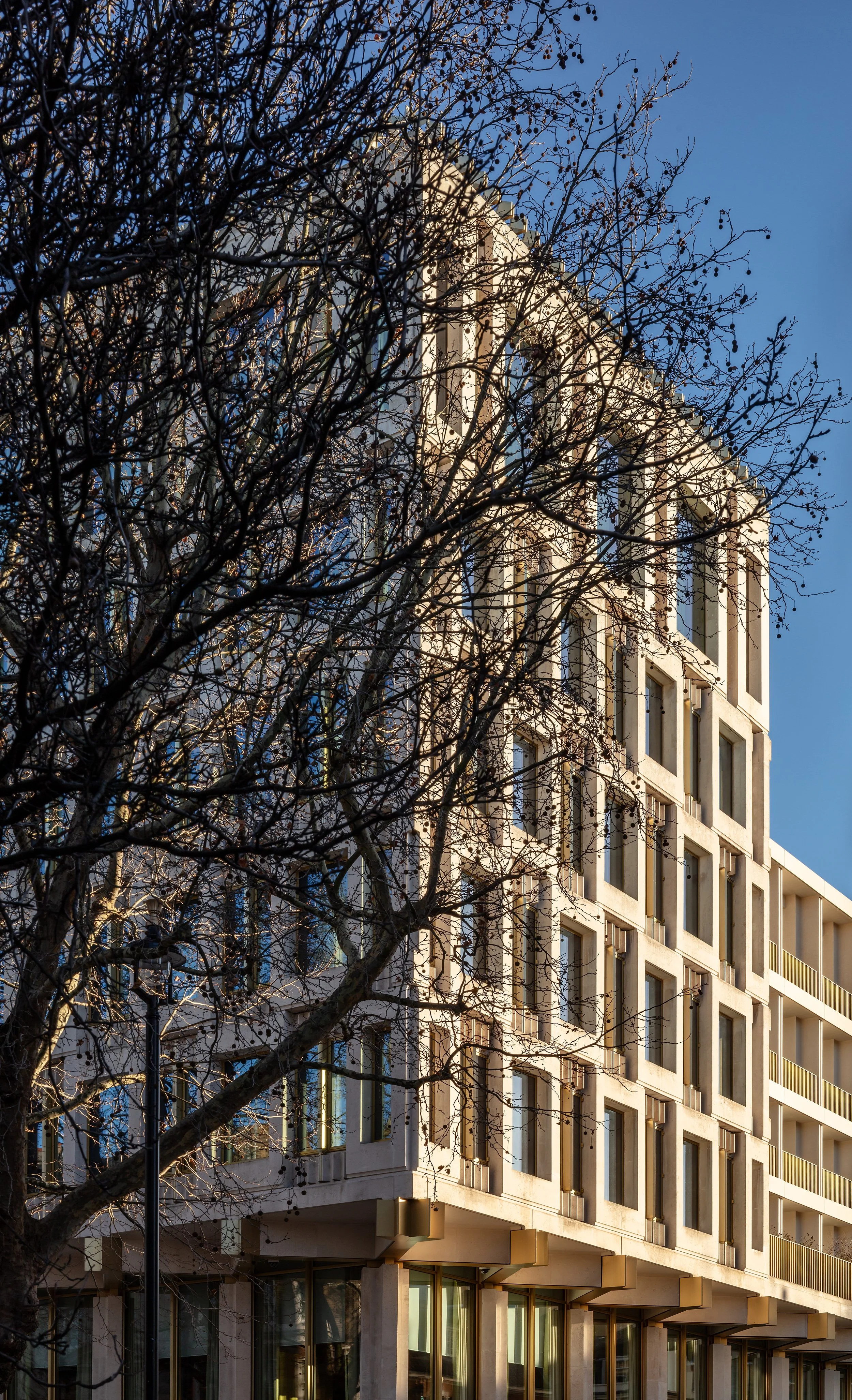 Enabling works were complex and involved innovative solutions. The original façade of concrete cladding and Portland Stone was listed and had to be retained while two new basement levels, in addition to the three already existing, were to be excavated to accommodate services and limousine parking as well as new front-of-house areas. As a result, the façade was suspended over this 30-metre-deep excavation for nearly three years. During this time, the exterior was enhanced with new gold elements, all the windows were replaced, replicating the previous profiles while significantly improving thermal and acoustic performance. The distinctive coping stones on the top of the building were relocated to the new rooftop level to join the restored bronze eagle. Throughout, careful account of the additional strain on the diagrid caused by the new top floor and densely packed plant on the roof had to be made.